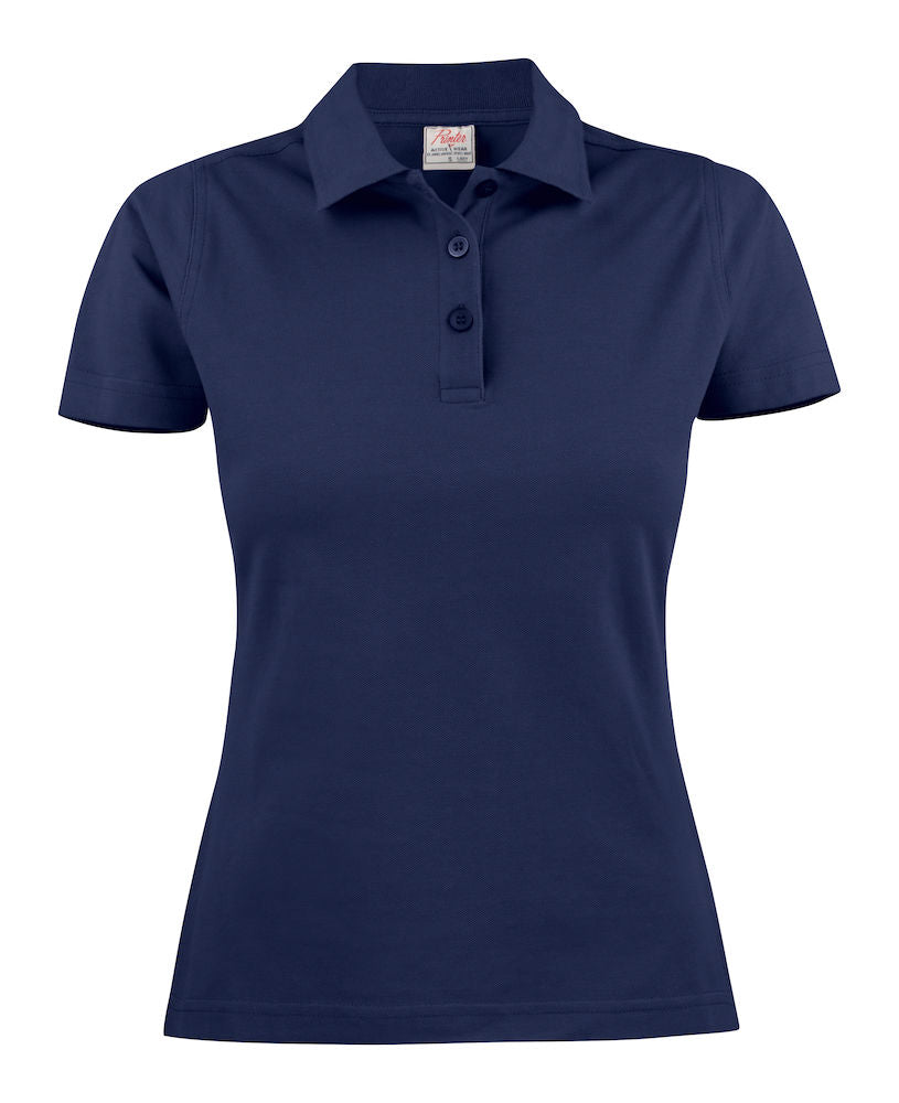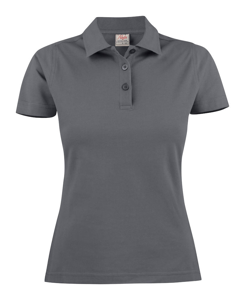 Shaped ladies’ solid coloured, piqué polo with side slits. Flat knit collar and placket with three matching buttons.