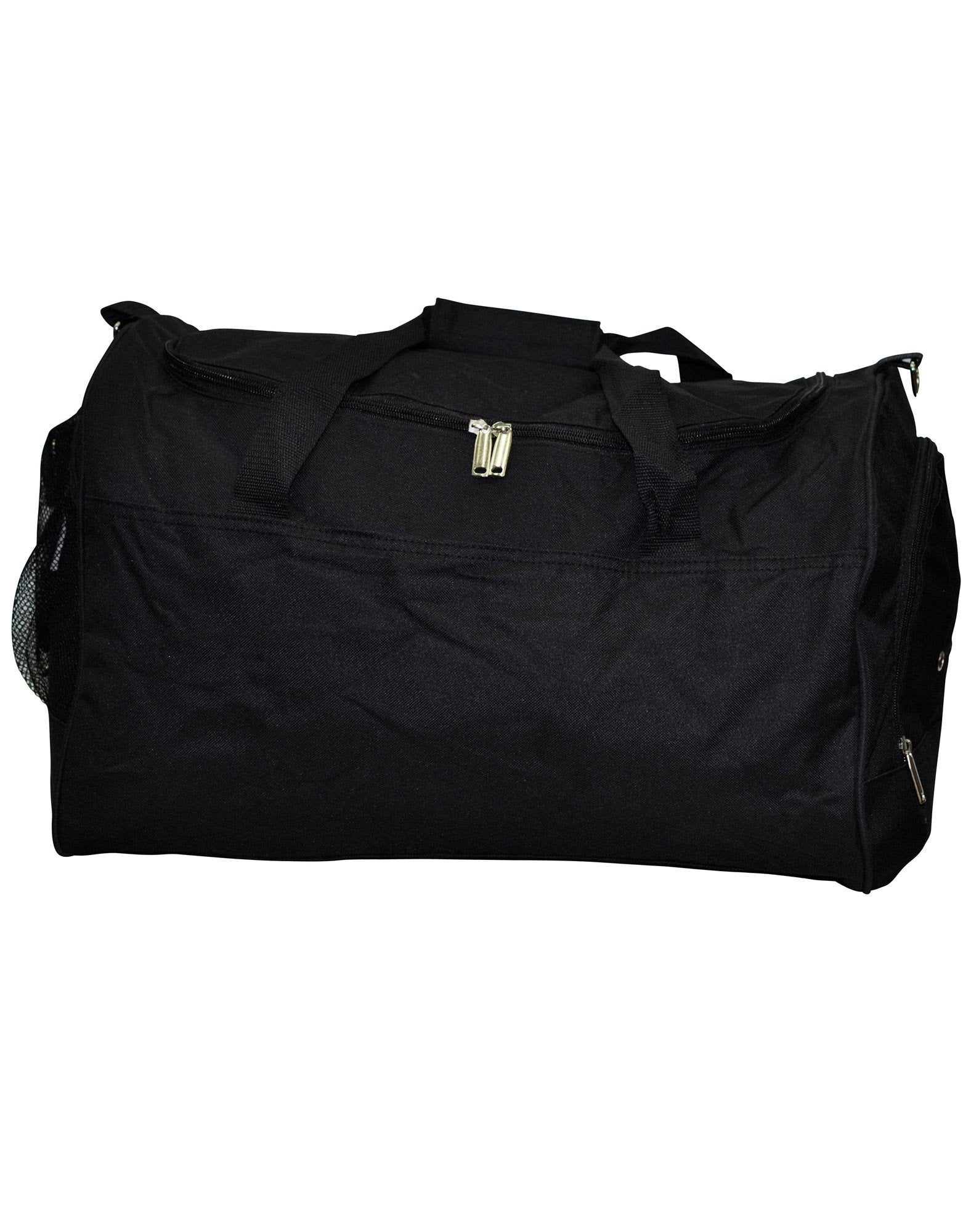 Features: U-shaped double zippered main compartment. Right side mesh pocket. Left side zipped shoe or wet items compartment with two gun metal eyelets outside pocket for ventilation. Reinforced carry handles. Adjustable and detachable shoulder strap. Plastic feet on base. Baseboard padding at bottom of bag to retain shape.